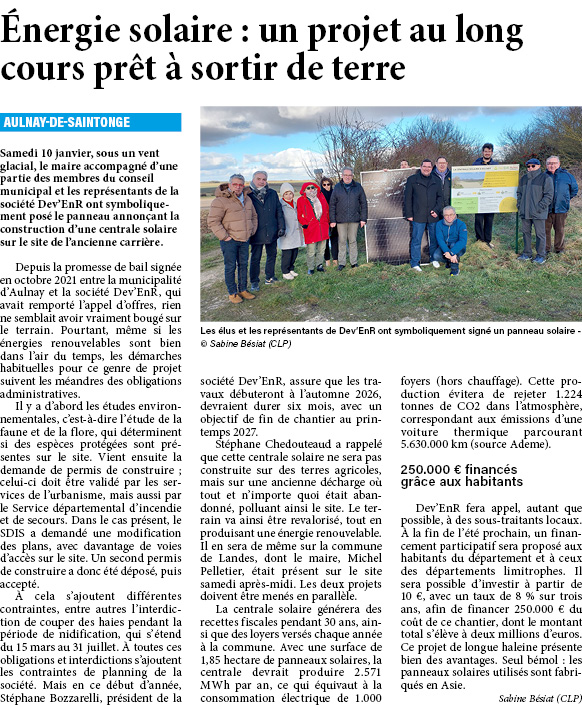 L’Angérien libre: Un projet au long cours prêt à sortir de terre à Aulnay-De-Saintonge 4 février 2026 Read More L’indépendant : Lauraguel. Belle réussite pour le premier marché de l’occasion 28 août 2025 Read More L’Angérien : Mazeray. La plus grande ombrière solaire de Charente-Maritime prend forme 25 février 2025 Read More L’indépendant : Lauraguel : une centrale solaire va sortir de terre 25 février 2025 Read More Sud Ouest : Mazeray, une ombrière géante sur le circuit du Puy de Poursay 21 février 2025 Read More Hélène FM : Mazeray : la commune aura la plus grande ombrière photovoltaïque de Charente-Maritime 19 février 2025 Read More
